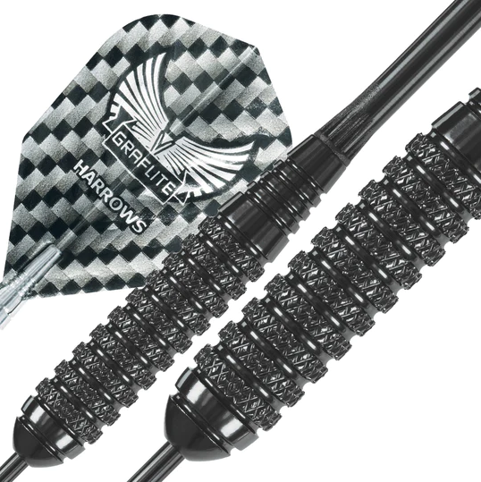 В комплект дротиков для классического дартса Harrows Black Arrow Ringed входит: 3 дротика, черные хвостовики Alamo Medium, оперенье Harrows Graflite и небольшой пластиковый кейс для хранения и транспортировки.