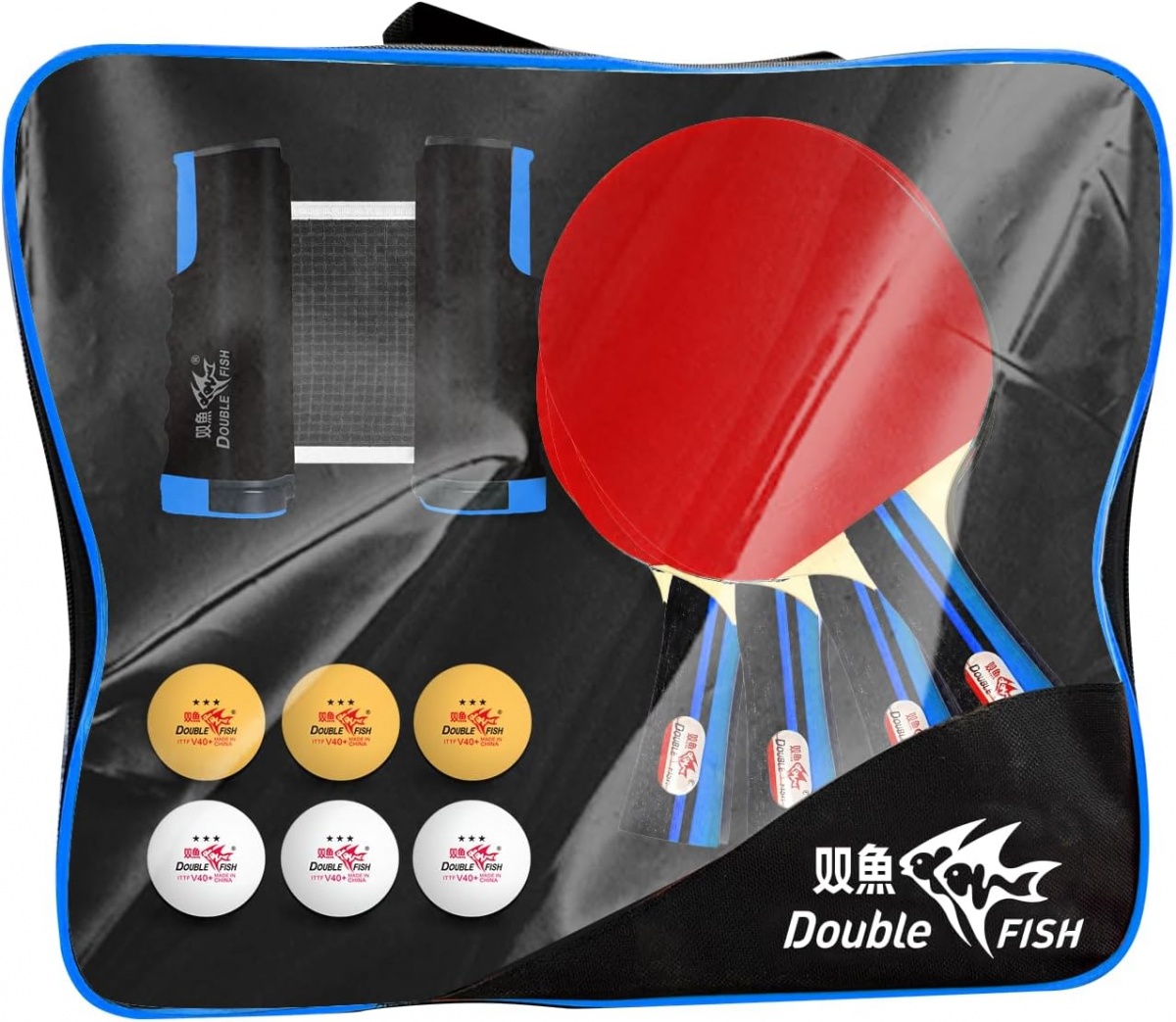 В комплекте 4 ракетки Double Fish Match 4 звезды, шесть мячей 3 звезды ITTF (3 оранжевых, 3 белых), сетка со стойками раздвижная, чехол.